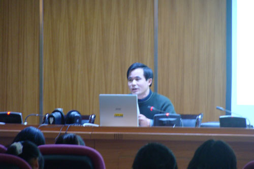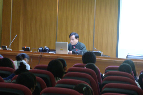 第三讲由公共基础部高祥德老师主讲,题目是《中国民俗文化之中国人起源说》,他首先简要地讲述了民俗和民俗学的产生、发展和分类及功能,重点是讲解民俗学中口承语言民俗重要问题――中国人起源说。从神话传说、考古发掘到原始宗教最后谈到混血的龙:引经据典,勾勒出中国文化产生及其最初发展的基本轮廓,使当代大学生真实地感受到了远古中国文化的魅力,也引发了当代大学生深入思考“中国人从那里来”千古话题,激发了当代大学生热爱中华民族,探求中国灿烂文化真谛的激情。 报告会进行进三个小时,学生们认真聆听了报告,报告会结束后,有学生主动上台与高老师交谈,希望有更多机会了解中华文化源远流长,博大精深的内涵。