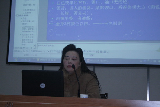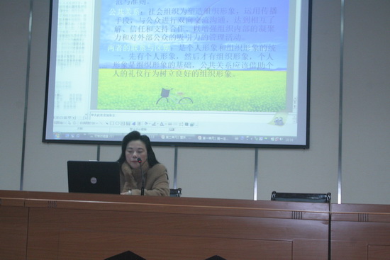 12月11日晚,经济贸易系王瑛副教授在图文信息中心大报告厅作题为“礼仪与公共关系”的专题讲座,这是我院2008―2009学年度第一学期“科学、人文、艺术素质教育系列讲座”第九讲。王瑛老师的讲座分两大部分,第一部分介绍商务礼仪,主要内容包括商务活动中仪容、仪态、服饰等形象礼仪,握手、递名片、打电话、馈赠、拜访、接待等社交礼仪,演讲、宴请、会议和洽谈等场合礼仪;第二部分讲述商务公关,主要介绍MI、BI和CI的组织形象设计,展览、庆典、公益等专题活动,新闻事件制造、策划技巧等新闻传播,危机管理等内容。 经济贸易系领导、部分教师和近500名学生聆听了王瑛老师的报告。