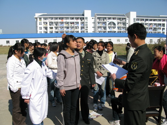 根据全国征兵工作会议和安徽省2009年冬季征兵工作电视电话会议精神,今年冬季征兵重点面向各级各类院校2009年应届毕业生,并首次面向社会公开征集女兵。我院学生积极响应国家征兵号召,有近百名女同学报名应征。 11月3日,我院开始进行2009年冬季女兵征集报名提名及初审初检。迎江区人武部、迎江区公安局和第一人民医院派员到我院对应征学生进行了初步的政审和体检,安庆电视台对我院征兵工作进行了报导。(文:王晓林)