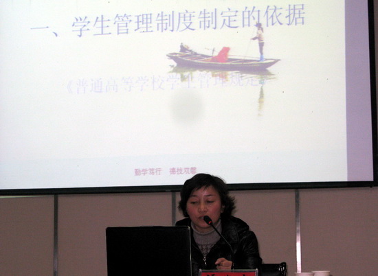 会上,教务处处长谭维奇、学生处处长高润霞、图文信息中心主任陈品生、实验实训中心副主任李进恩分别就我院教学管理制度、学生管理制度、质量监控制度、实践教学制度进行了解读。