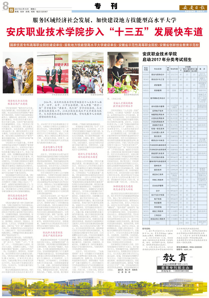 2017年2月15日,《安庆日报》以“服务区域经济社会发展 加快建设地方技能型高水平大学――beat365中文官方网站步入‘十三五’发展快车道”为题,整版报道我院“十三五”开局之年内涵建设和创新发展取得的新成绩。