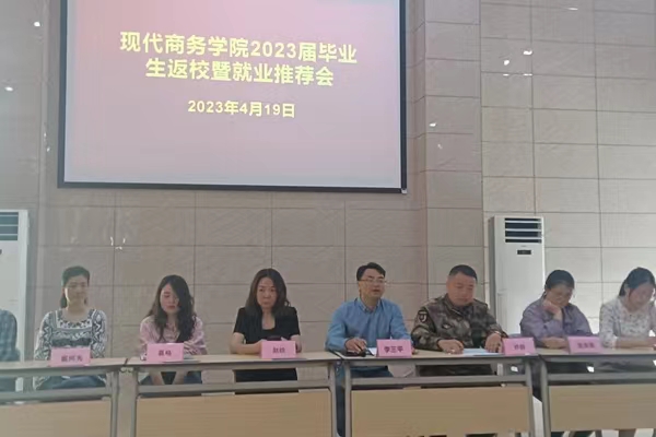 4月19日下午,现代商务学院举办2023届毕业生返校暨毕业生就业推荐会。迎江区人民政府征兵办公室、滨江街道有关负责同志及有关企业负责人,该院学生工作分管负责人,2023届全体返校毕业生、毕业班辅导员、班主任,院学生会、团总支学生干部代表等近200余人参加会议。