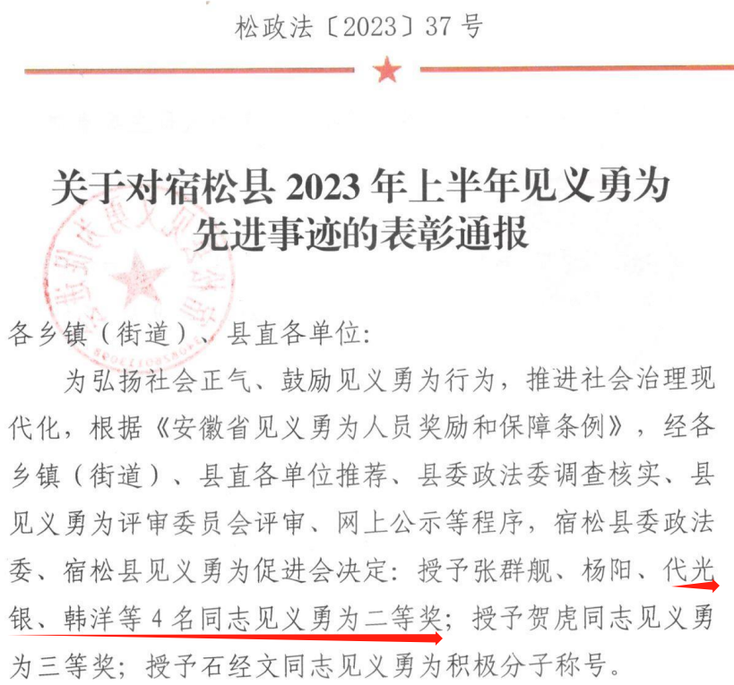 为弘扬社会正气、鼓励见义勇为行为,近日,宿松县政法委、宿松县见义勇为促进会对宿松县2023年上半年见义勇为、先进事迹进行了表彰通报,beat365官网建筑工程学院2021级建筑工程技术4班学生代光银、韩洋被授予见义勇为二等奖。