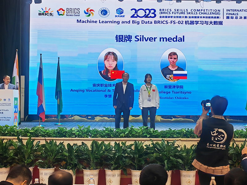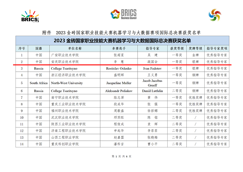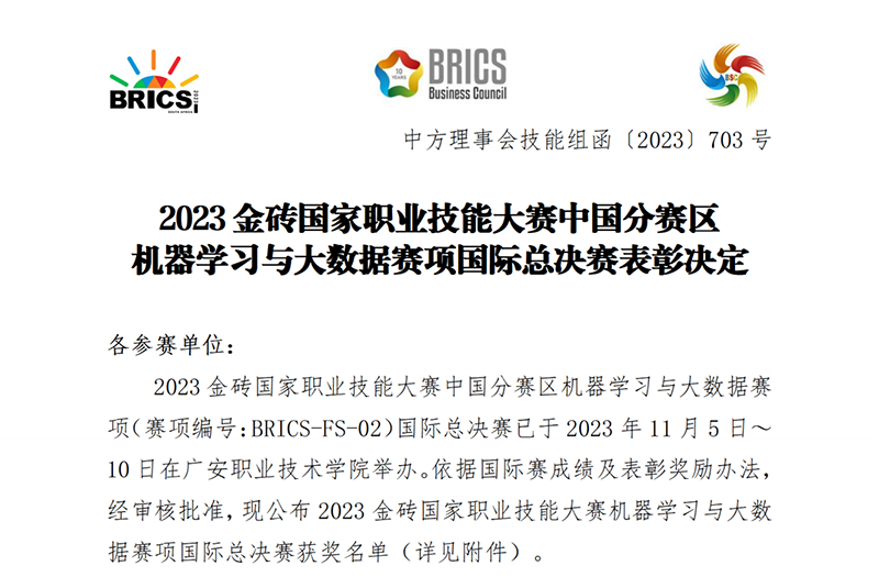 11月21日,2023金砖国家职业技能大赛组委会(金砖国家工商理事会技能发展工作组)发布《2023金砖国家职业技能大赛中国分赛区机器学习与大数据赛项国际总决赛表彰决定》,beat365官网信息技术学院李慧同学以总分第二的成绩获得一等奖,并获得银牌,信息技术学院院长疏国会教授荣获2023年金砖国家职业技能大赛“机器学习与大数据”赛项国际总决赛优秀指导专家称号。