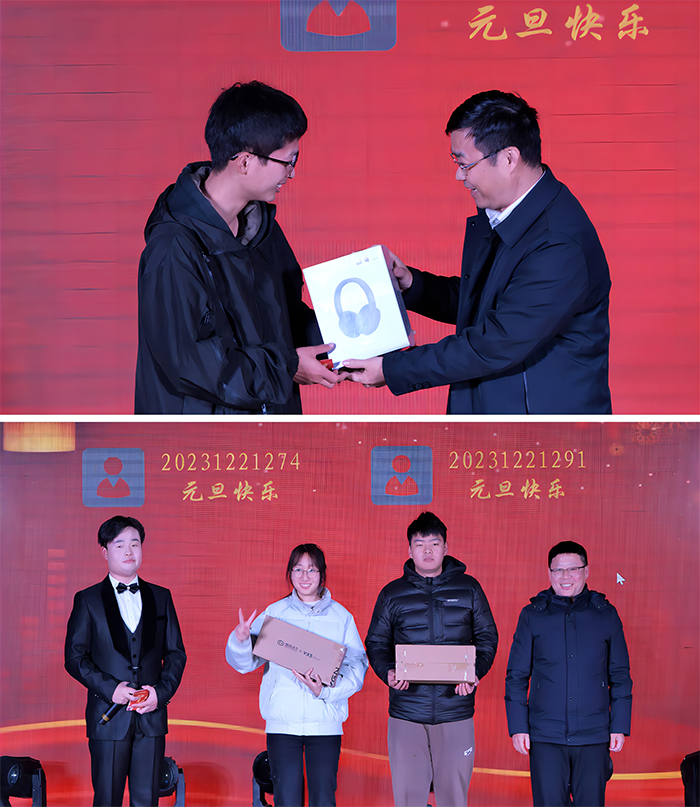 信念新媒体工作室的同学特别用心地剪辑了一段视频,带着大家一起回顾了信息技术学院的师生们在2023年里发生的故事,一帧帧一幕幕让人思绪万千。在晚会抽奖环节,大屏上号码翻滚,大奖逐个揭晓,会场一片沸腾。