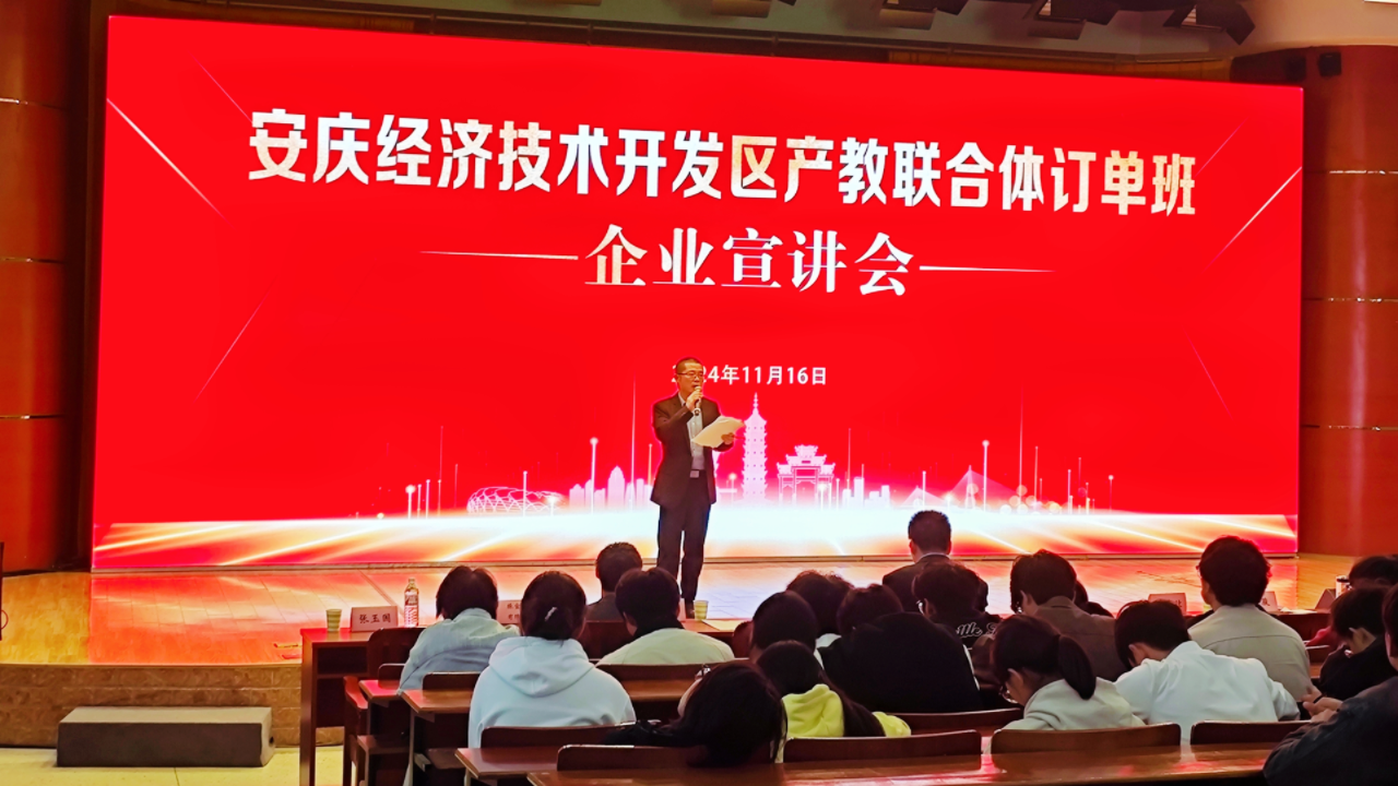 为加强产教融合,助力本地企业人才招引,扎实推动安庆经开区产教联合体订单班组建工作,进一步提升beat365官网服务安庆地方经济高质量发展能力,2024年11月16日,在校图文信息中心一楼报告厅,举行安庆经开区产教联合体订单班宣讲会,活动分成上下午共两场。校党委副书记李克让出席活动,安庆经开区人社局主管方蕾、校企合作办、招生就业处、机电工程学院相关负责人以及2024级新能源汽车、机电一体化、工业机器人、汽修等专业班级的辅导员、学生共计1000余人参加宣讲会。