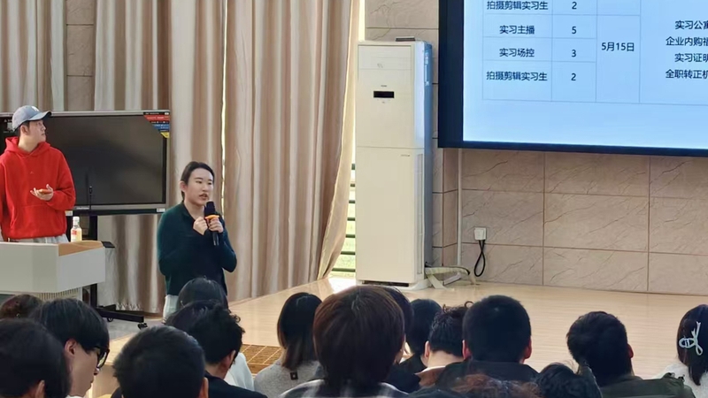 宣讲会上,张修硕围绕亚鲁特食品(安徽)有限公司发展、品牌矩阵、岗位需求、薪资福利、实习安排及转正通道等内容进行详细宣讲。她重点介绍实习主播、实习场控、拍摄剪辑实习生三大核心岗位,清晰展示岗位职责、成长路径与发展空间。集团直播业务负责人刘义蒙以“从新人到优秀主播:核心能力与成长路径”为主题,结合实操经验分享行业干货,帮助同学们了解岗位核心能力要求与职业发展前景。