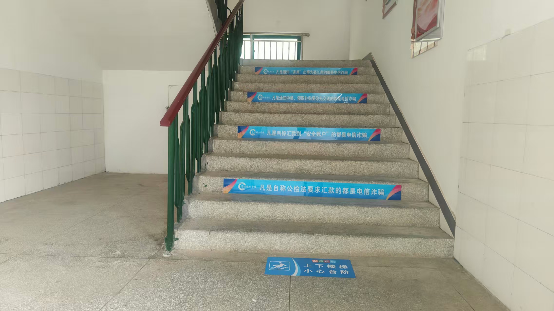该院注重反诈宣传氛围的营造,4月初以来陆续在教学楼楼梯台阶等公共区域张贴反诈宣传标语,并系统展示“十大诈骗套路”等实用知识。同时,在宿舍水房、楼道间等学生生活高频场所张贴防诈提醒,使学生在日常环境中潜移默化地接受教育,实现“抬头见反诈、时时受教育”。通过环境布置与日常渗透相结合,巩固校园安全阵地。