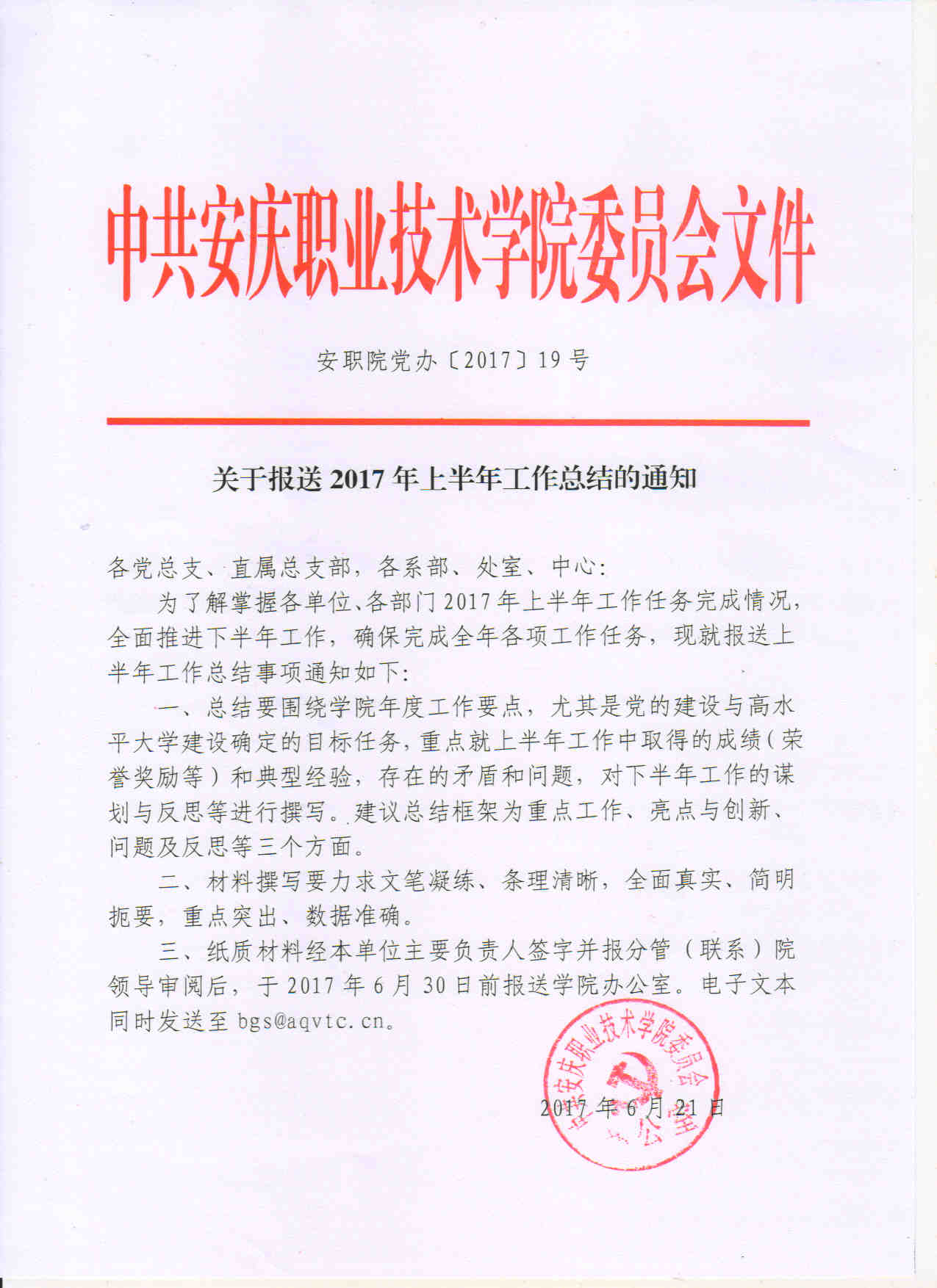 关于报送2017年上半年工作总结的通知