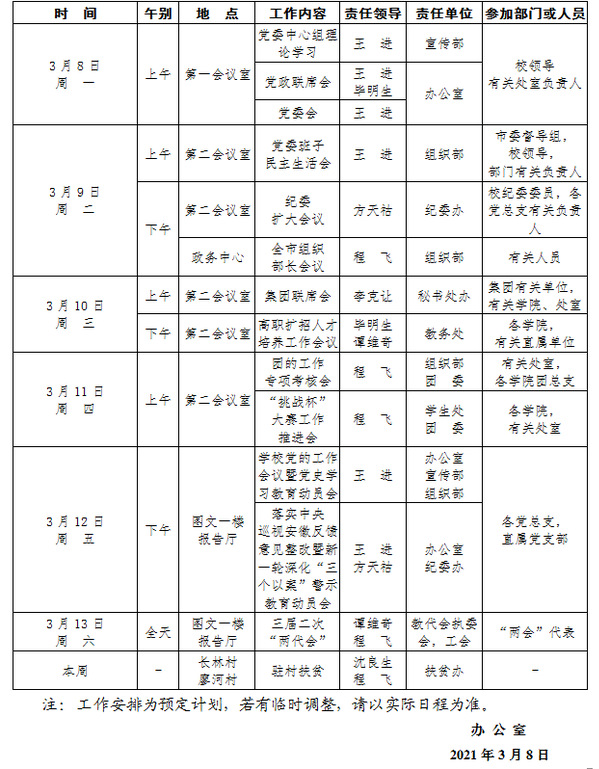 2020-2021学年第二学期第2周(3.8-3.15)工作安排