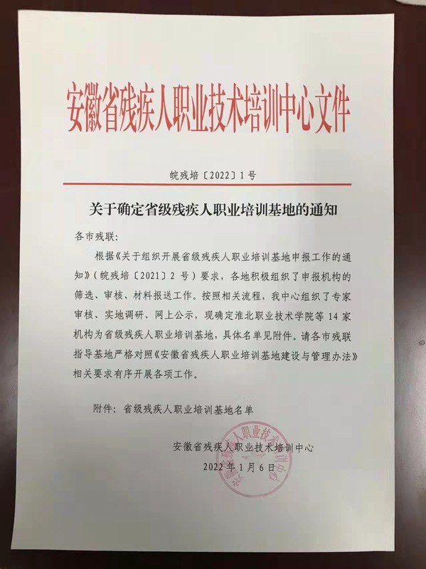 1月6日,beat365官网获批省级残疾人职业培训基地,这是beat365官网在培训基地建设方面又一重大成果。