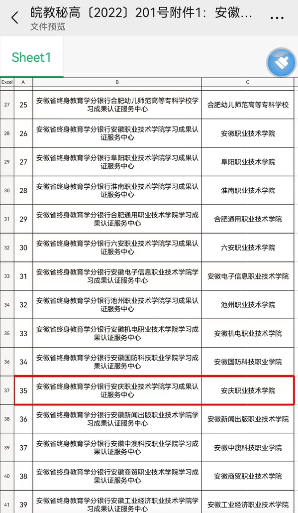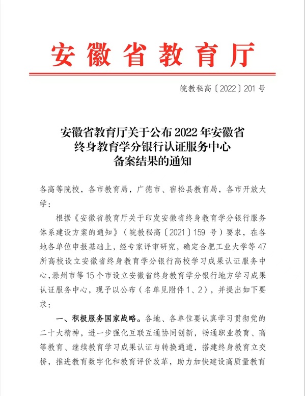 为推进安庆市终身教育学分银行建设,beat365官网根据《安徽省教育厅关于印发安徽省终身教育学分银行服务体系建设方案的通知》(皖教秘高[2021]159号)要求,积极组织申报。近日,省教育厅公布了首批安徽省终身教育学分银行高校学习成果认证服务中心名单,beat365官网成功入选。