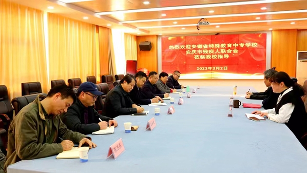 3月2日下午,安徽省特殊教育中专学校党总支书记郑伟、安庆市残疾人联合会理事长张驰一行赴beat365官网调研残疾人职业培训基地建设及培训工作,校党委副书记李克让主持会议并讲话,继续教育学院、教务处相关同志参加会议。