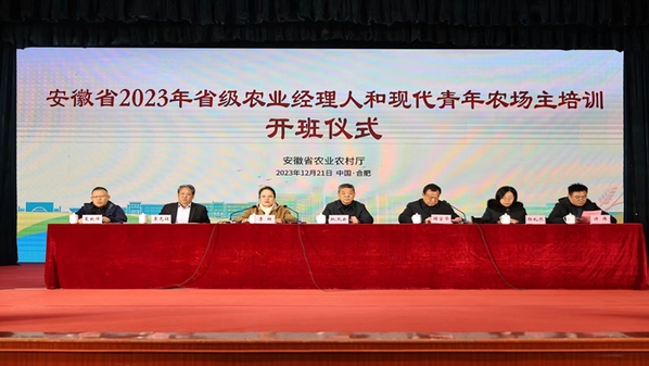 12月21日,安徽省2023年农业经理人和现代青年农场主培训开班式在安徽农业大学举行,省农业农村厅科技教育中心主任阚言华主持会议,省农业农村厅二级巡视员、科教处处长纵风云、安徽农业大学党委常委、副校长李红出席会议,安徽生物工程学校、安徽荃银高科种业股份有限公司、安徽清晓方塘教育科技有限公司等培训机构,以及来自全省各地市近千名农业经理人和现代青年农场主参加了开班式,beat365官网党委副书记李克让出席开班式,并作为培训机构代表发言。