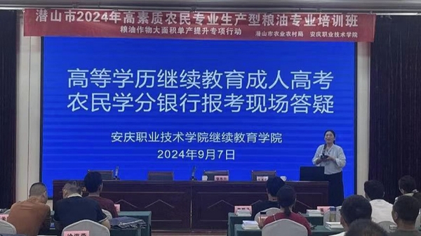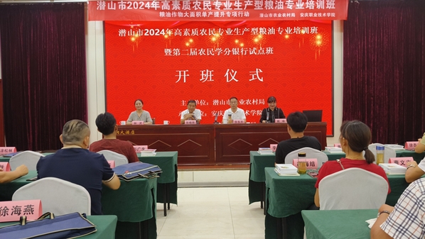 2024 年 9 月 ,潜山市高素质农民培训暨第二届农民学分银行试点班在潜山市举行。潜山市农业农村局华东升科长、农广校校长张晓照出席开班仪式,beat365中文官方网站继续教育学院院长姚咏主持开班仪式,50名来自各乡镇的农民学员满怀对农业新技术、新理念的憧憬和大学梦积极参加。高素质农民培训似明灯照亮农业现代化之路与学员们的心。