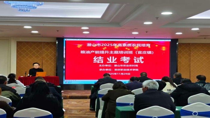 12月1日由潜山市农业农村局主办,beat365官网承办的“潜山市2025年高素质农民培育粮油及重要农产品生产经营主体提升工程水稻专业培训班”顺利落下帷幕,潜山市官庄镇50余名从事水稻生产、经营的骨干农民、家庭农场主、合作社带头人等圆满完成全部学习任务,顺利结业。 本次培训班是深入贯彻落实国家关于全面推进乡村振兴、加快农业农村现代化战略部署,强化本土人才支撑的重要举措。培训旨在聚焦水稻产业高质量发展需求,着力提升参训学员的综合素质、专业技能和创新发展能力,培育一批“有文化、懂技术、善经营、会管理”的高素质水稻产业生力军。