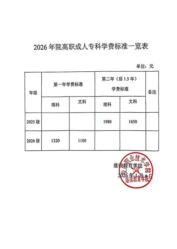 2026年高职成人专科学费标准