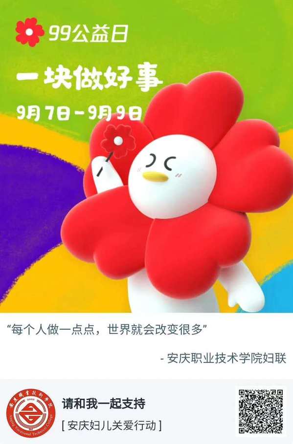 我们一起为爱助力!为响应安庆市妇联发起的“安庆妇儿关爱行动”99公益日活动,9月7—9日,学院妇联积极宣传、组织开展“99公益日”网络募捐活动。