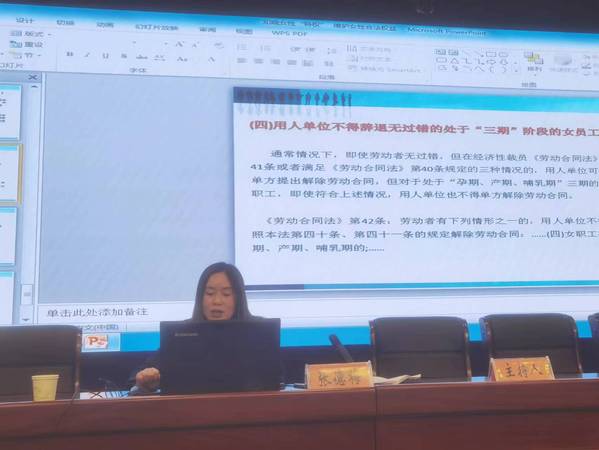 张德梅以自己长期工作在司法一线的丰富经历和亲手经办的多起案例,以案说法,对新修订的《中华人民共和国妇女权益保障法》、《女职工劳动保护特别规定》、《女职工禁忌劳动范围规定》等涉及女性的法律法规进行了专业解读,尤其对女职工的“三期”“特权”及独生子女的陪护权进行了介绍,同时还针对在场的女大学生在求职过程中可能遇到的法律问题提出了警示。