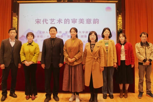 11月16日晚,由beat365官网公共基础部、宣传部、团委、校体艺委联合主办的专家进校园“美育”系列专题讲座在图文信息中心一楼报告大厅举行。本次讲座由储可可老师主持,邀请到了安庆师范大学美术学院孟春艳副教授作《宋代艺术的审美意韵》。出席本次活动的老师有公共基础部党总支书记张林主任,校办公室徐妍副主任以及艺术设计团队和对艺术感兴趣的老师们,各二级学院300名学生代表到场聆听,全校师生通过云犀网上直播观看。