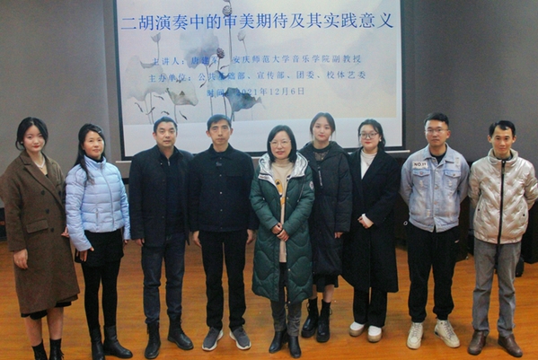 12月6日晚,由beat365官网宣传部、团委、公共基础部、校体艺委联合主办的专家进校园“美育”系列专题第三场讲座,在三栋教学楼216实训室举行。本次邀请到了安庆师范大学音乐学院副教授、安庆市音乐家协会秘书长唐建军作题为《二胡演奏中的审美期待及其实践意义》的讲座。出席本次活动的老师有校体艺委办公室相关负责人,校企合作单位安徽辰夫科技有限公司代表、艺术教研室和对艺术感兴趣的老师们及现代商务学院、机电工程学院200名学生代表到场聆听。全校师生通过“云犀”网上直播进行了观看,讲座由音乐教师罗文雍主持。