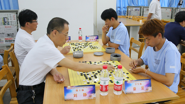 比赛一局定乾坤。赛场上,教工队选手个个沉着稳定,举手投足尽显大家风范;学生队选手人人意气风发,有着初生牛犊不怕虎的劲头……老将童宏葵执黑先行,星小目开局,抢占实地,稳中求进;年轻小将乔隆基针锋相对,展开对攻,双方一开局就你攻我挡、你来我往,扭杀在一起;黑棋抓住白棋打入过深、棋形过重的缺点,对两块白棋展开了缠绕攻击,让白棋首尾不能相顾,最终导致打入过深的那块白棋大部分被吃。白棋发现形势不妙,展开强手,开始搅局;黑棋沉着应对,稳扎稳打,让白棋无机可乘,最终白棋中盘投子认输。其他棋盘上,选手们你攻我守,针锋相对,互不相让,难分难解,恰似沙场点兵,无声胜似有声。