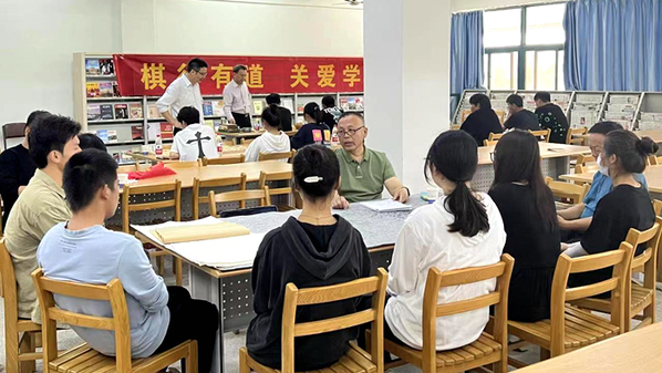 这天上午,图文信息中心大楼二楼设立了两处活动场所。一处是爱好书法的同学围坐在书法家童宏鑫和张光举的周围,聆听着他们的讲座;另一处是童宏葵与3名爱好围棋的同学对弈并指导,工会章杰义老师与8名爱好象棋的同学对弈并指导。