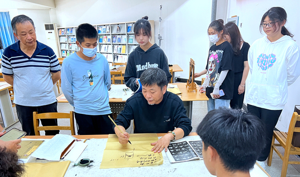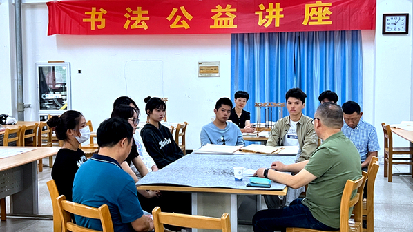 “书法作为国粹之一,国学的一个重要组成部分,2013年教育部就提出书法进课堂,近几年开设书法专业的高校不断增多。”张光举老师的书法作品今年也入展安徽省第三届隶书大展,他分析了近些年书法专业发展的趋势,鼓励同学们要做一个有目标、有理想的人,坚持不懈,勇攀学习高峰。“书法是中国特有的文化符号,作为学生,把字写好是最基本的要求。这也能提高我们的欣赏水平和审美能力。感兴趣的同学可以多下功夫学习书法专业,也能实现自己价值。”张老师讲得神采飞扬,同学们听得入神,不时向张老师请教自己在练习书法中遇到的问题,张老师一边用毛笔在纸上画着,一边深入浅出地讲解着。