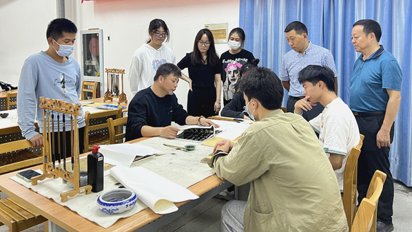 两位书法家的讲座不仅吸引了同学们,还受到学校老师的欢迎。爱好书法的机电工程学院赵夫超老师,听说了今天的活动,专程慕名而来,认真地坐在同学们中间,听着他们的讲解;还带上自己平时练习的作品,请两位书法老师指教。一旁不少爱好书法的工作人员,也忙里偷闲,围拢过去,他们纷纷就自己书法练习中的困惑,不时提问,张老师一一作答,解疑释惑。