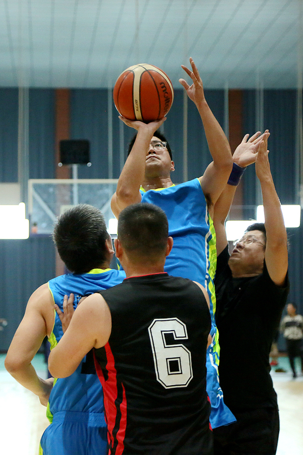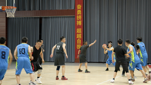 身着黑色球衣的机关队个个精神抖擞,生龙活虎,一改平时文质彬彬的状态。24号队员唐厚明在赛场上从容自若,来回奔跑,7分13秒时,他远投命中,3分!为机关队首开得分。紧接着,机关队8号队员多次内线突破,屡屡得分。第一节结束前1分钟唐厚明再次3分远投命中。身着蓝色球衣的师生联队人人斗志昂扬,意气风发,展现出勃勃生机。9号队员童宏葵精神饱满,容光焕发,矫健的身姿在球场上来回穿梭。开场仅32秒师生联队19号球员申彪便一马当先上篮得分,师生联队旗开得胜。机关队第一节结束比分13:7机关队领先。第二节,师生联队换上了一批年轻球员,开场仅1分钟,6号队员何旺三分远投命中。面对师生联队强烈的攻势,机关队也换上了较年轻的队员。虽然双方越战越勇,战况焦灼,比分紧咬,交替上升,但赛场上始终贯穿着文明赛球的风格,队员之间动作理性。上半时比赛结束22:21机关队领先。