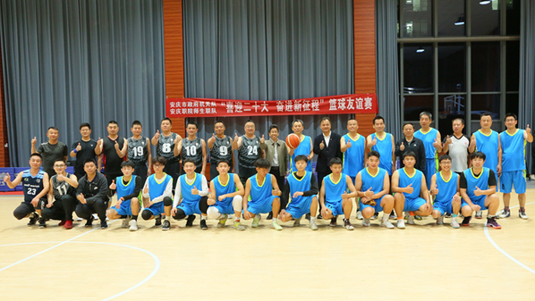 为丰富学生们校园文化生活,10月12日晚,安庆市政府机关队与beat365中文官方网站师生联队开展了篮球友谊赛。赛前,副市长唐厚明率市政府机关队全体队员与beat365中文官方网站党委书记童宏葵、校长毕明生、副校长程飞、党委委员李五一和师生联队全体球员、裁判员合影留念。