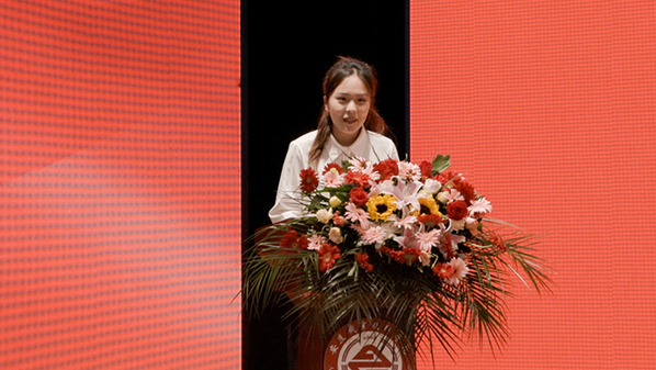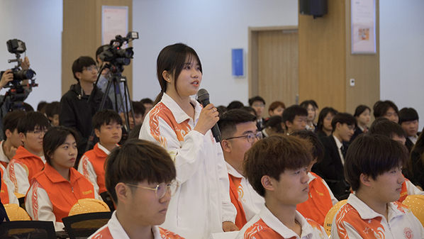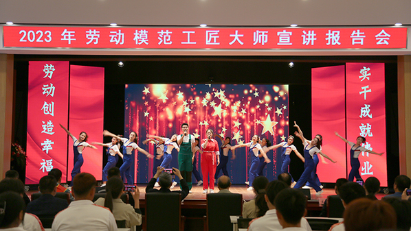 宣讲会上,单德森、舒畅、彭一言、杨俊四位劳模工匠,分别向在场的学生讲述了自己的工作经历和励志故事。他们将岗位当作舞台,把职责当作使命,在平凡的岗位上创造了不平凡业绩,其身上真诚奉献、追求卓越的精神感染了在场的每一位学生,赢得了现场观众的阵阵掌声。劳模先进代表还与现场的同学们进行了交流互动,对他们所提出的问题一一进行了答疑释惑。活动中,beat365官网管理服务学院的同学们激情表演了主题歌舞《劳动最光荣》,将现场气氛推向高潮;活动最后,beat365官网机电学院的张紫璇同学现场率领同学们,发出了“志存高远、爱岗敬业、守正创新、求真务实、甘于奉献、砥砺前行”的倡议。