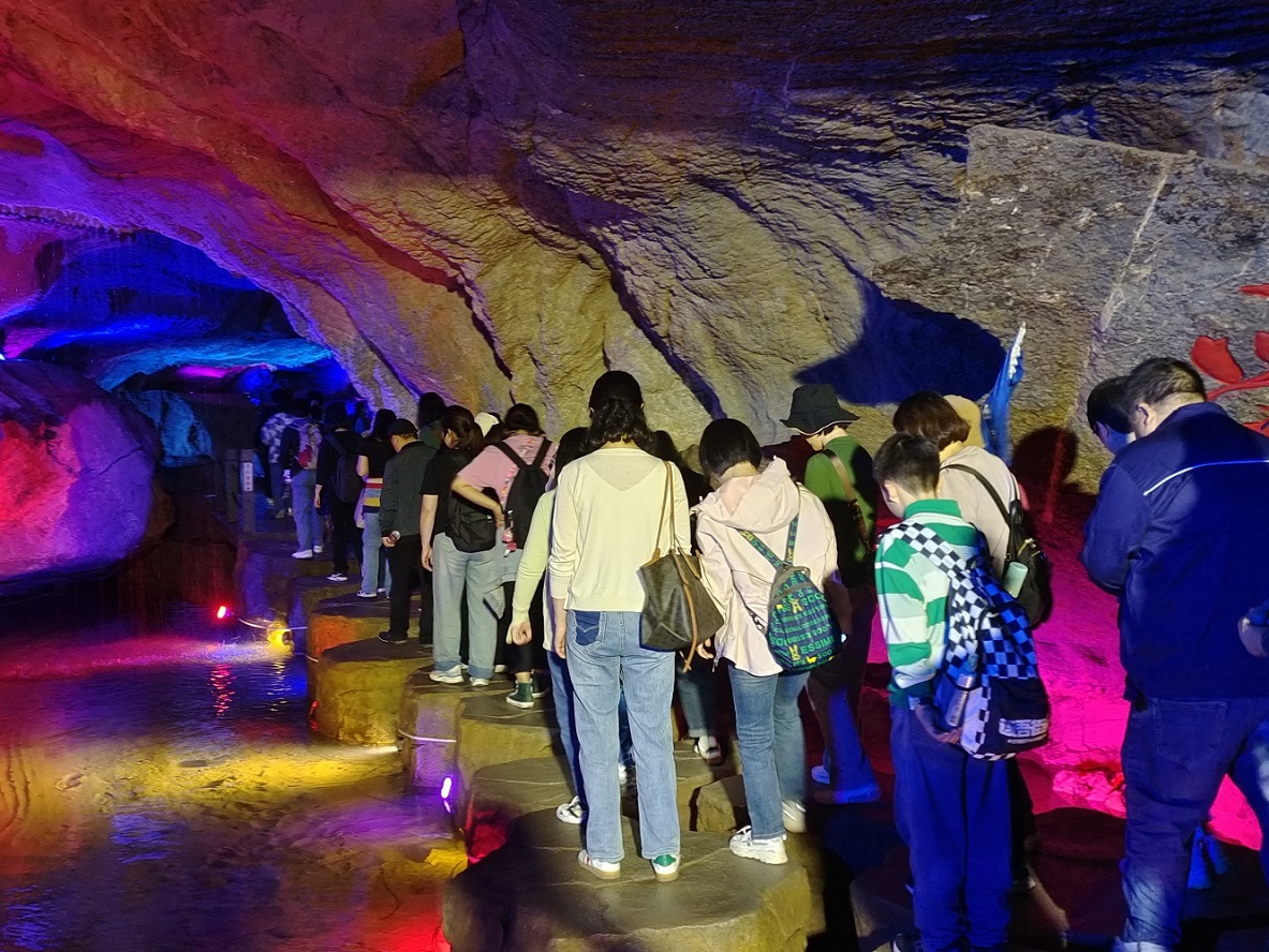 大家兴致勃勃游览了慈云洞,该洞是皖南第一个集观光、艺术教育、溶洞探险、地质科普为一体的慈孝主题幻境溶洞,洞内钟乳累累,景水相连,步步有景,清秀俊美,并有地下河从洞内蜿蜒而出,全长3500米,让大家纷纷感叹大自然的鬼斧神工。