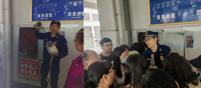 随后,郭骏峰向现场人员讲解了灭火器使用的方法与注意事项,介绍了楼内消火栓消防软管的连接和开关方法。