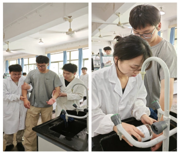 活动于14时30分在分析楼406实验室开始,本次模拟主要分为氢氧化钠溶液泼溅在皮肤上,在学生向老师报告意外后,任课老师及时安抚学生情绪并进行相关处理,随后张禾茂再次强调实验室安全注意事项,对于情况紧急的学生建议送往医院救治。