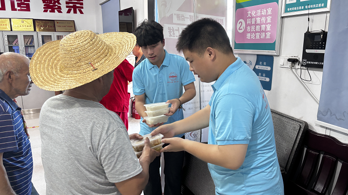 实践队首站走进合肥市肥东县回民村,以“文化润心”为切入点,开展民族团结主题宣讲,筑牢中华民族共同体意识。队员们通过图文展板、互动问答等形式,向村民普及回族历史、传统节日及非遗技艺,让村民在沉浸式体验中感受中华文化的多元魅力。宣讲结束后,队员们化身“社区服务员”,协助社区食堂开展“爱心送餐”行动。队员们顶着烈日穿梭于楼栋间,将热气腾腾的饭菜送到老人手中,用实际行动传递温暖与关怀。