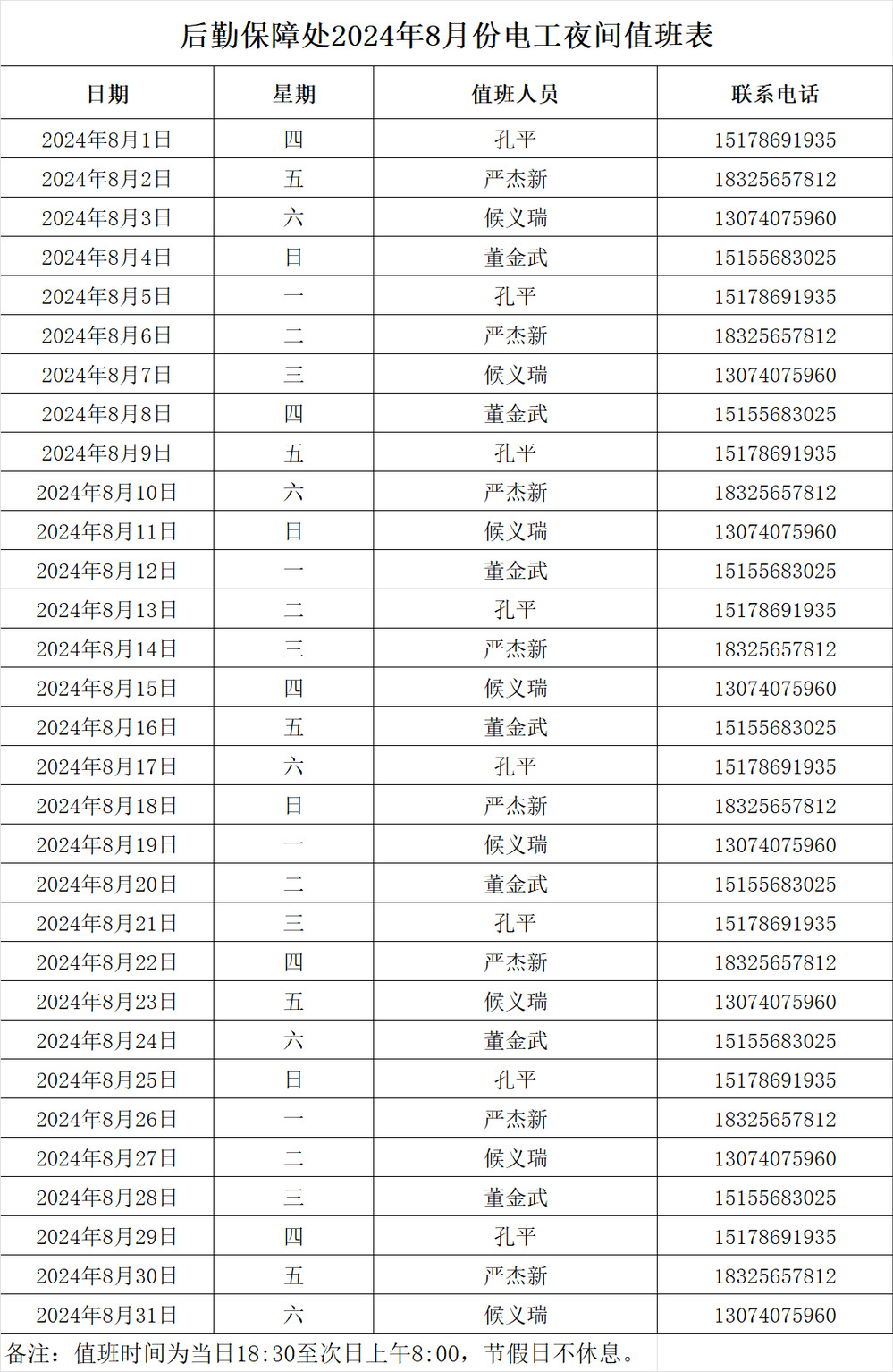 后勤保障处2024年8月份电工夜间值班表