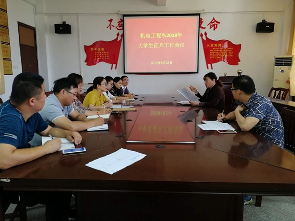 5月23日,机电工程系1号教学楼208会议室召开2019年度大学生征兵工作会议,分管学生工作负责同志、团总支书记全体专职辅导员及班主任参加此次会议。