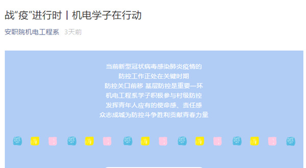 自新型冠状病毒感染的肺炎疫情发生以来,机电工程系按照学院的要求和部署,统筹协调系部全体师生,上下一体,各司其职,多举措并举,齐心防疫,为这场疫情防控的人民战争贡献自己的力量。