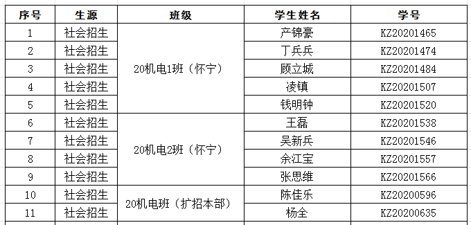 机电工程学院2020级机电一体化1班(扩招怀宁)学生产锦豪、丁兵兵、顾立城、凌镇、钱明钟,2020级机电一体化2班(扩招怀宁)学生王磊、吴新兵、余江宝、张思维,20机电一体化(扩招本部)陈佳乐、杨全,一直未参与规定的教学活动,辅导员多次联系学生及其家人,未果。现根据《beat365中文官方网站社会扩招学生学籍管理实施办法(试行)》的相关规定,要求以上11位同学于2024年4月23日前务必联系辅导员参加规定教学活动,否则将依据《beat365中文官方网站社会扩招学生学籍管理实施办法(试行)》第二十六条规定,视为自动放弃学籍,按自动退学处理。