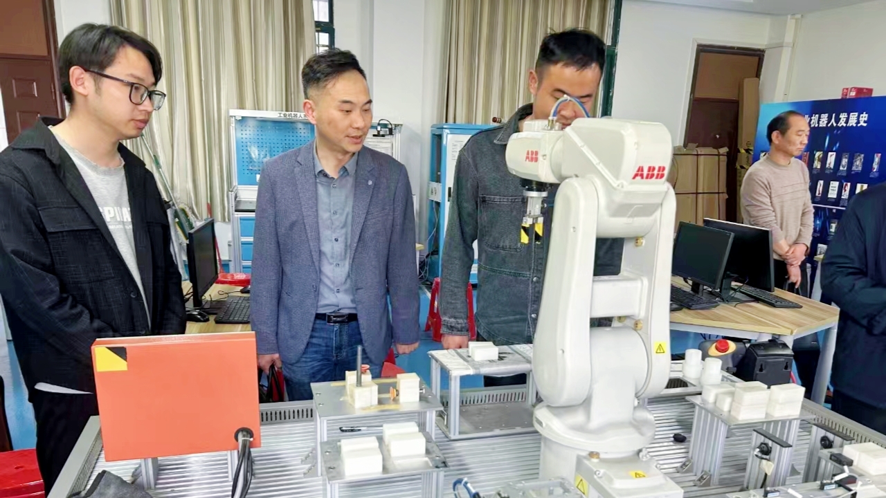 随后,来访团进行实地考察,沉浸式体验实训教学场景。来访团先后参观了我院汽车产教融合实践中心、工业机器人技术实训基地、机电一体化综合实训室。在工业机器人技术实训室,代表团观摩了学生操作ABB机器人完成零部件智能装配的全过程,对我院“将真实生产项目转化为实训课题”的做法表示肯定。