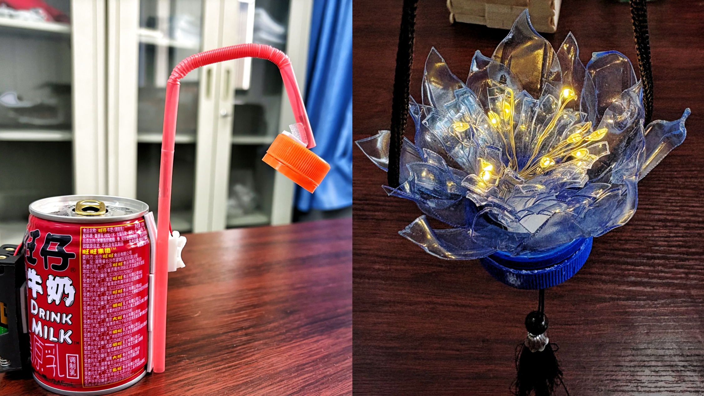 还有一部分同学将旧电池、易拉罐、塑料品等元件重新组装,制作出了如易拉罐台灯、“塑料宝莲灯”等简易智能小装置,展现出了对科技与环保的独特思考。城轨专业黄耀同学向大家介绍:“这是我用喝过的牛奶罐做底座,从损坏的遥控赛车上拆下的灯线和电池盒组成的电路闭合系统制作的易拉罐简易小台灯,内部还放有香薰石”。