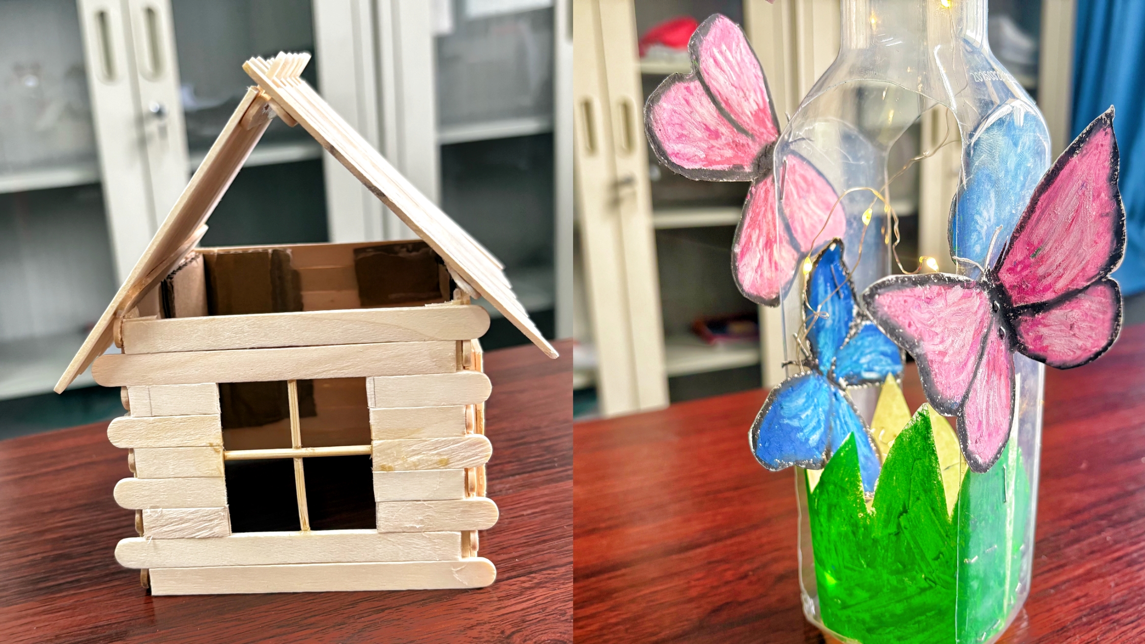 一部分同学将废弃的纸盒、木棒、羽毛球、塑料瓶等改造成为精美的小工艺品,让原本容易被人们丢弃的生活垃圾摇身变成了造型独特的艺术品。如机电专业的梅子升同学兴奋地介绍:“我所制作的环保小夜灯是由废弃塑料瓶、低能耗LED灯以及手绘蝴蝶图案组成,我希望通过它向同学们传递变废为宝这一理念。”数控专业的李孟桥同学拿着他的纸盒坦克,介绍说:“我喜欢军事方面的模型,所以我利用瓦楞纸精心打造了‘环保卫士’坦克手工模型,这也是创意与环保理念的完美融合。”