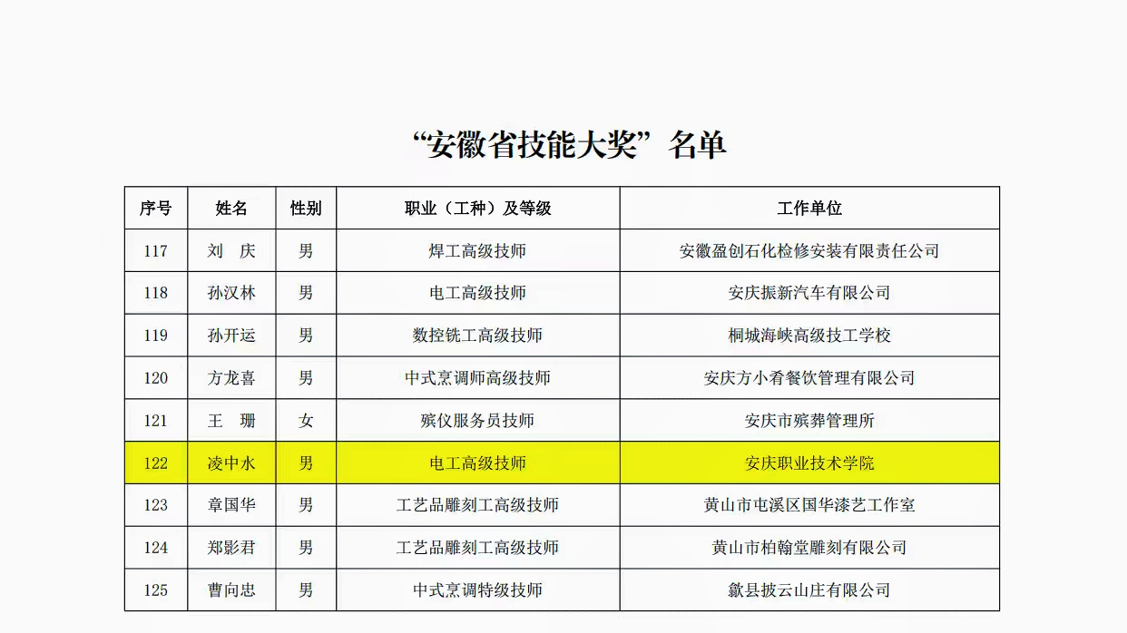 “安徽省技能大奖”是中共安徽省委组织部与安徽省人社厅联合设立的省级奖项,旨在表彰在生产服务一线岗位上技能精湛、业绩突出的高技能人才。获奖者凌中水同志,长期深耕教学科研一线,不仅在技能攻关上成就斐然,更在技艺传承与人才培育方面贡献突出。从教以来,他主持省部级以上课题7项,发表论文5篇(其中三类论文3篇,二类论文2篇),拥有30余项国家发明专利,他不仅是2023年安徽省首批“江淮技能大师”,其领衔的工作室亦于同年获评安徽省省级技能大师工作室,成为技术攻关与传艺育人的核心平台,他本人多次在全国行业技能大赛中折桂,同时积极指导学生参赛,助力学生在省部级以上赛事中取得突破。