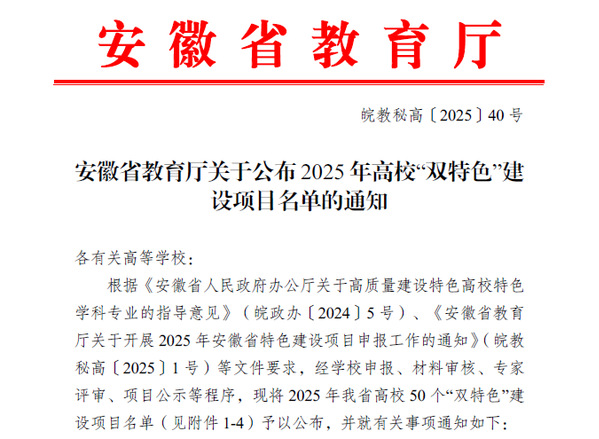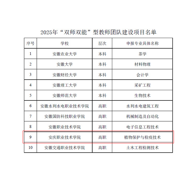 近日, 安徽省教育厅印发《关于公布2025年高校“双特色”建设项目名单的通知》,beat365官网植物保护与检疫技术专业教师团队成功入选安徽省高校双特色项目“双师双能团队”。