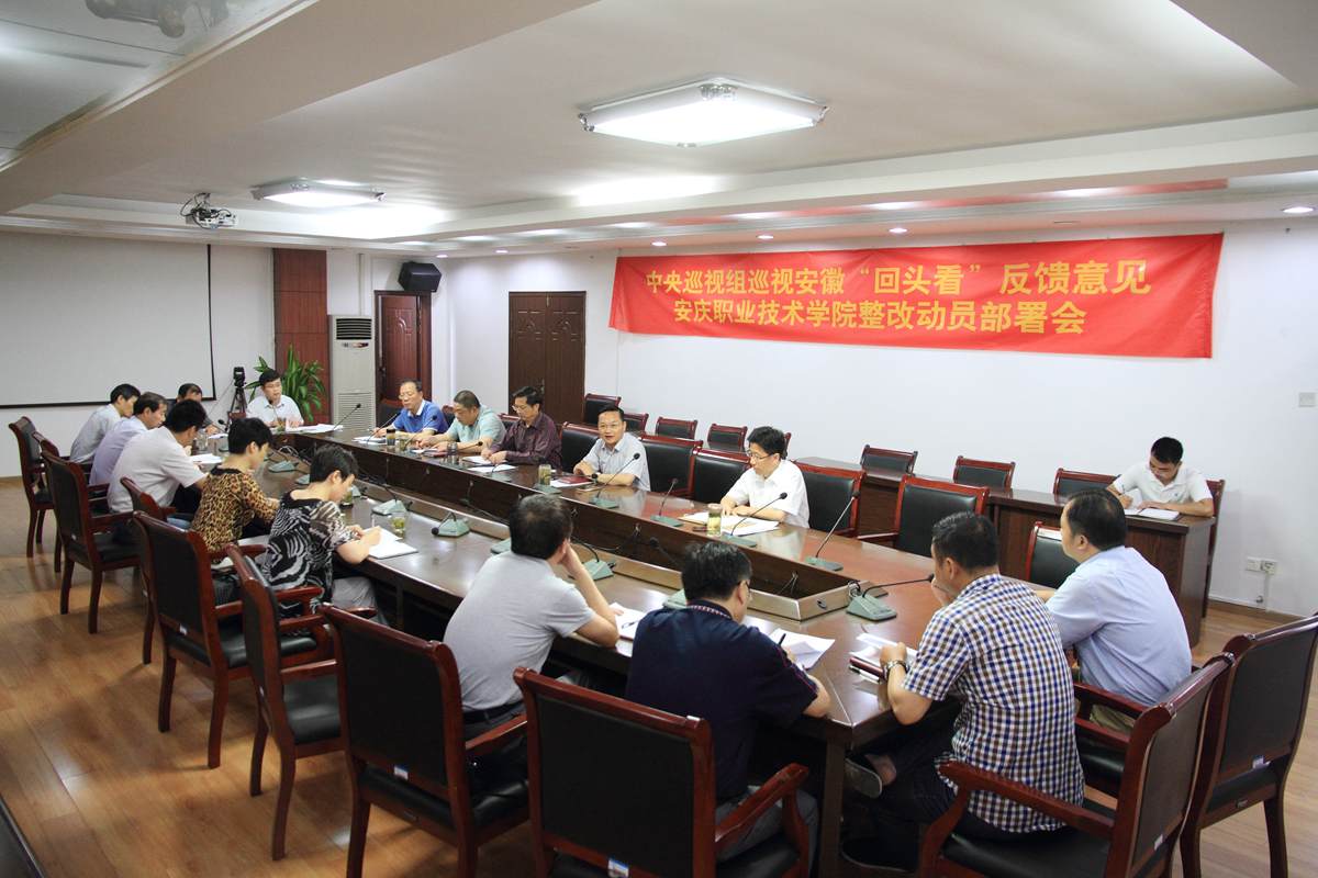 王进在会上传达了省委召开的中央巡视组巡视安徽“回头看”反馈意见整改专项整治推进会和市委召开的整改动员部署会的精神。他说,省、市委会议召开后,院党委在市委整改清单基础上结合省委高职高专第十四巡视组提出的问题和意见,认真研究制定了整改方案。为落实整改方案,王进在会上提出四点要求。一要提高认识。思想认识是前提,认识到位才能整改到位。要强化“四个意识”即强化党要管党意识、强化依法依规意识、强化敢于担当意识、强化廉政风险意识。二要彻底整改。要坚持问题导向、注意举一反三、着眼长效机制、注重整改实效“四个原则”。三要强化领导。学院党委成立巡视整改工作领导小组,明确了责任人和责任单位,要加强对巡视整改工作的督查指导。四要促进工作。通过整改和整治,推进当前工作,重点做好如下六项工作。一是做好本学期结束前的教学管理各项工作;二是做好招生宣传和就业指导工作;三是做好建设项目、教科研项目申报、招标和建设工作;四是做好“两学一做”学习教育和结对帮扶工作;五是做好“七一”纪念表彰、出席市第十一次党代会代表选举和总支、支部换届选举工作;六是做好暑假期间和新学期各项准备工作。 王进特别指出,巡视“回头看”反馈整改要按党委统一要求,逐一整改落实,按步就班推进整改工作,确保学院“十三五”规划和地方技能型高水平大学建设开好局、起好步。 方天祜在会上宣读了《中共beat365中文官方网站委员会关于落实市委反馈意见的整改方案》。