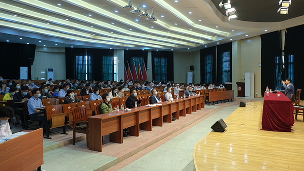 在家的校领导、全校副科级以上领导干部以及学生团干代表,共计150余人现场聆听了报告。