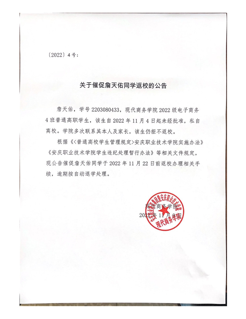 关于催促詹天佑同学返校的公告