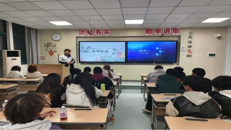 活动伊始,主持人引导大家共同追溯了诗词的起源及其文化价值。随后,几位对诗词怀有深厚热情的学生勇敢地走上讲台,向在座的同学们朗诵了他们钟爱的古诗词。他们充满激情的朗诵,淋漓尽致地展现了古诗词的韵律之美和情感深度。紧接着,一场诗词飞花令接龙游戏点燃了现场的气氛,同学们踊跃参与,争先恐后地展示自己的诗词才华。这个游戏要求参与者依次说出含有特定字或词的诗句,不仅考验了大家的记忆力,还激发了对古典文学的热爱和兴趣。随着游戏的推进,现场的气氛变得越来越热烈,同学们的脸上洋溢着快乐和满足的笑容。活动的高潮阶段,同学们以丰富的想象力和创造力,创作出富有创意的诗歌。这些作品在表达方式上灵活多变,同学们在创作过程中既享受了乐趣,又锻炼了思维和语言技能。作品完成后,他们兴奋地相互交流和分享,彼此学习和启发。这种互动不仅加深了他们之间的友谊,还激发了对诗歌及文学的热爱和探索。