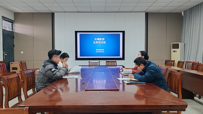 为规范外聘教师管理,更好发挥外聘教师在学院人才培养中的作用,现代商务学院加强外聘教师资源库建设,本学期开学前,学院教学负责人带领专业负责人对新进外聘教师进行试讲评议和听课指导,2月26日下午,现代商务学院组织开展了外聘教师业务培训会,该院教学负责人主持并开展业务培训,教学管理科科长苏传胜、何洪港和黄菲两位外聘教师参加了活动。